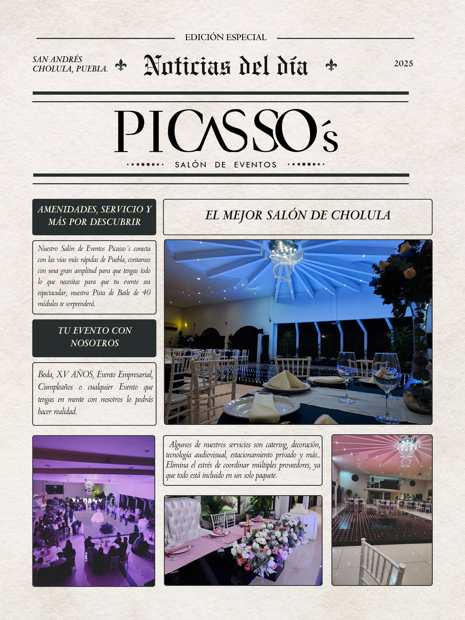 Cada evento en nuestro Salón Picasso’s es inolvidable, cada parte está hecha para que que cada celebración sea perfecta. Ven y descubre todo lo que tenemos para ti.